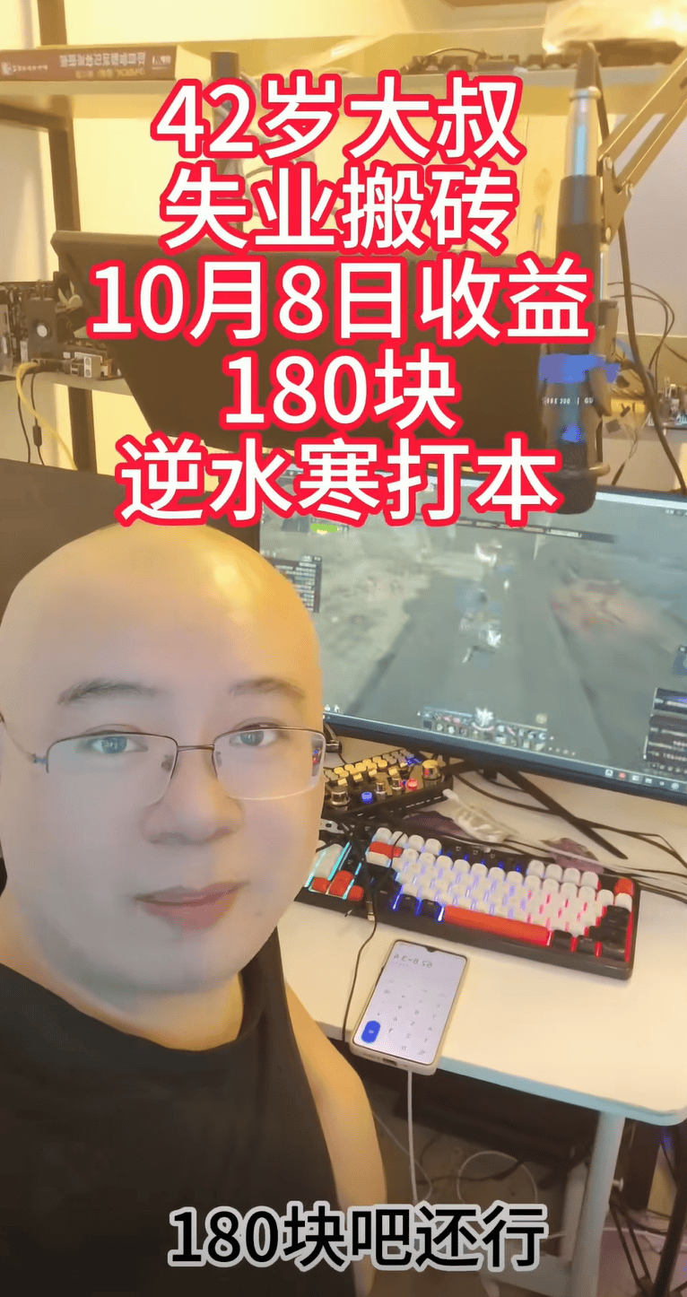 42岁的老陈在中年失业后,每天也在通过逆水寒黄金服搬砖挣钱,他每天收入在200元左右,再加上自媒体的收入,一个月差不多进账万元,可以维持一家四口的开支。