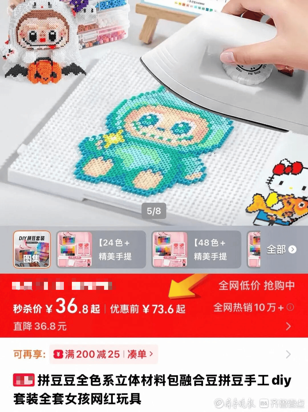 记者在电商平台搜索发现,拼豆豆子价格多在每千颗1.3元至6元之间,多款材料包月销量突破10万件,部分热门单品日销超500单。除豆子外,豆盘、熨斗、豆笔等配套工具也同步走俏,销量表现亮眼。