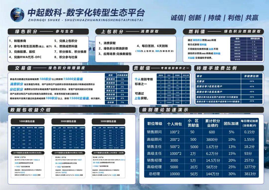 这套职级体系设计得非常精细:从销售顾问到总经理,7个等级对应不同的个人要求、直推人数、积分和燃料值门槛,收益比例从5%逐步提升到30%+7%。更关键的是,它加入了“同级奖励”“团队加速”“贡献值考核”等规则——比如销售经理可享团队收益加速20%,直推7号数据包赠480积分,直接把推广行为和高收益绑定。