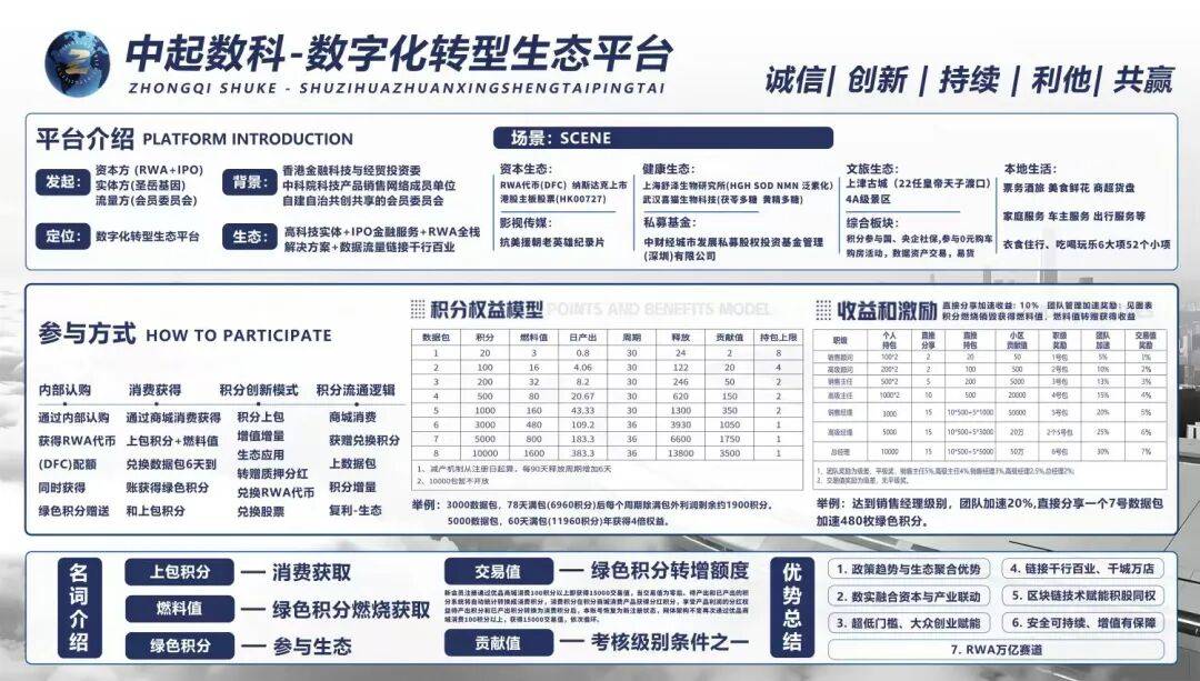 先明确一个核心认知:中起数科这套模型,本质是“概念包装+积分玩法+层级激励”的复合型营销体系。它没有脱离传统模式的内核,却用RWA、IPO、实体生态等热点概念做了高密度包装,精准戳中了普通人“想赚快钱又求稳”的心理。咱们从营销视角,一步步拆解它的造局逻辑。