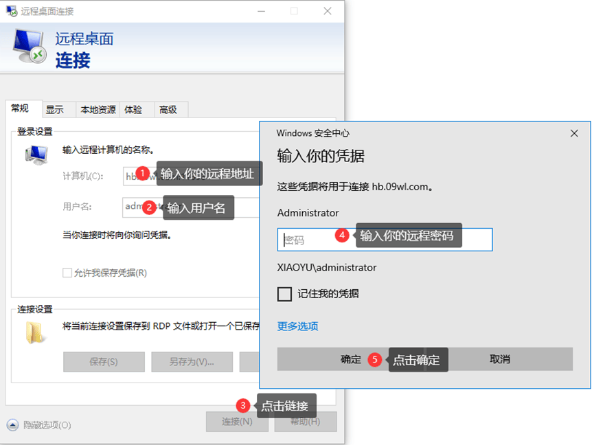 其次,电脑B上找到mstsc(电脑左下角,点击搜索,输入“mstsc”即可调出此页面),输入电脑A上得到的远程地址和用户名,点连接,之后在新的对话框输入A的密码,点击确认,如图所示: