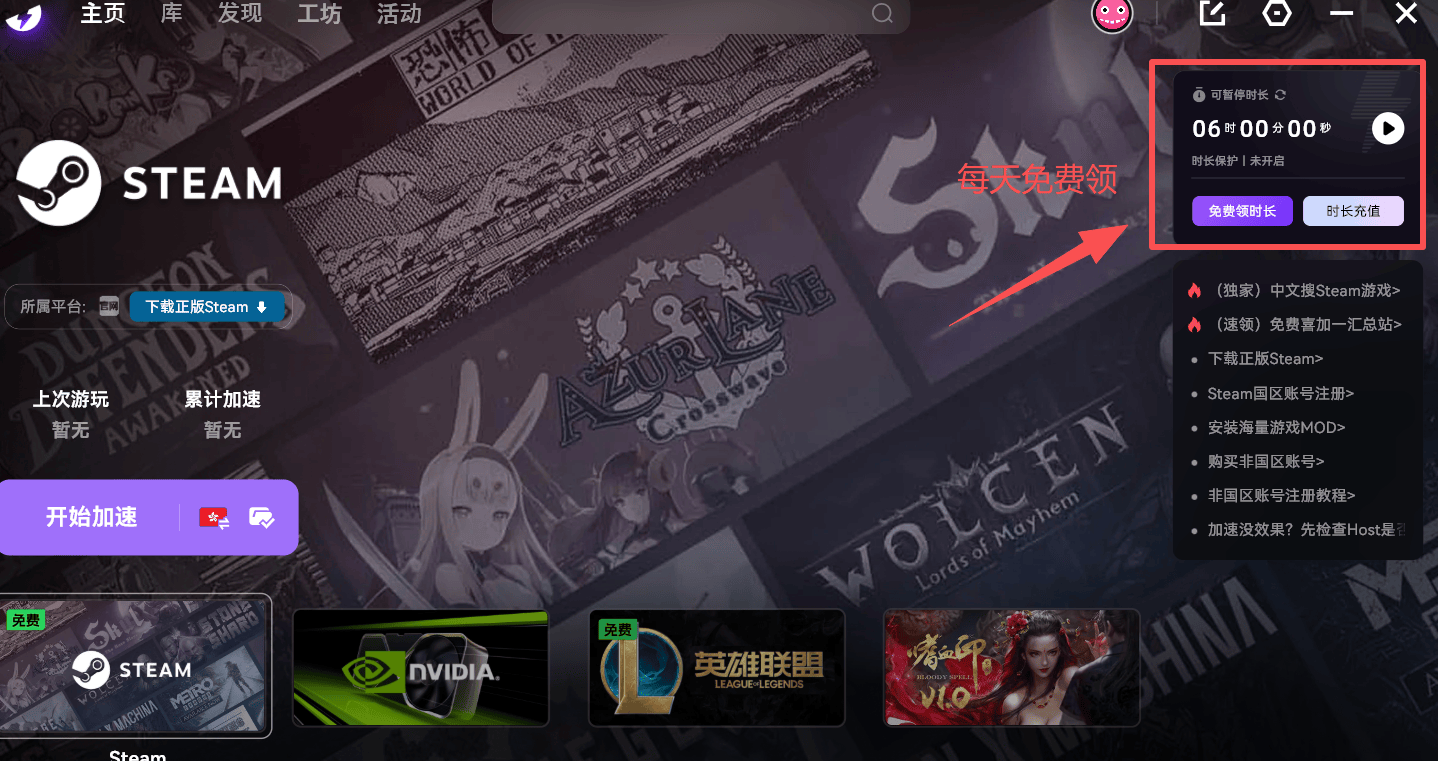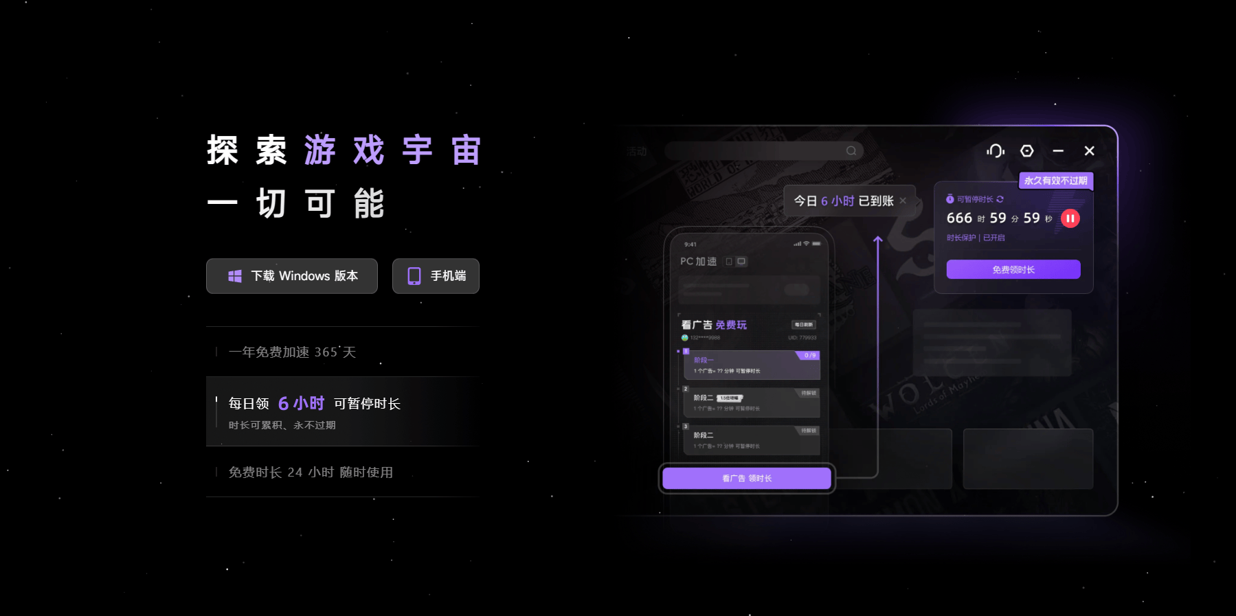 ● PC端:每天看广告或做简单任务,每天能领约6小时免费时长,支持一键暂停,不用不扣时,我相信不少人一天玩游戏根本没有6小时,所以就直接等于根本用不完。